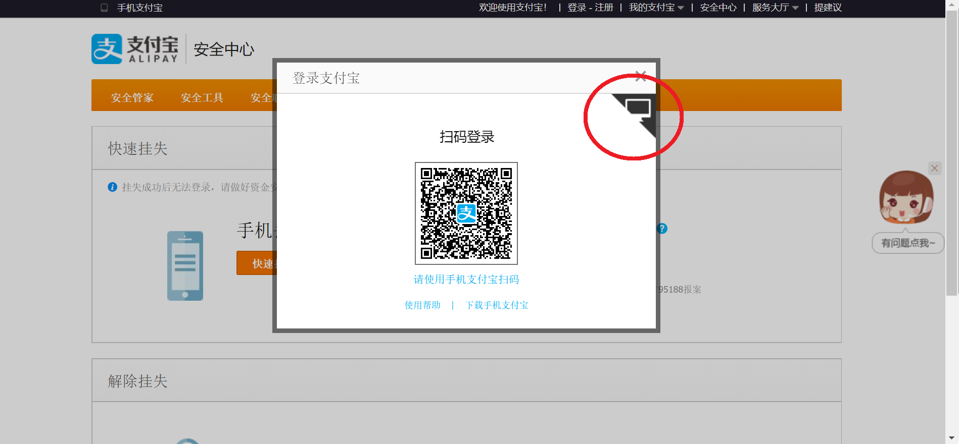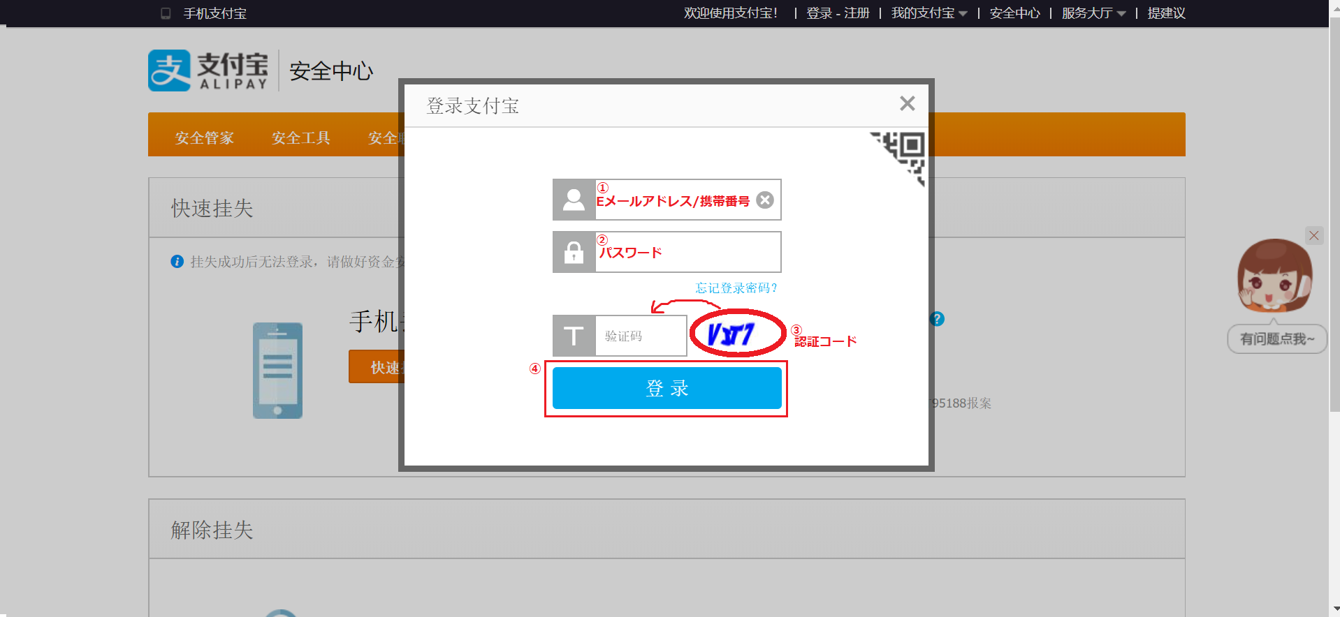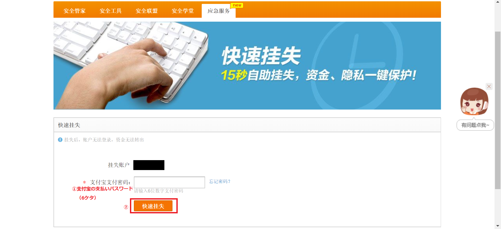 画面が移ったら、(1)支付宝の支払いパスワード(6ケタの数字)を入力して、(2)「快速挂失」をクリックしてください。