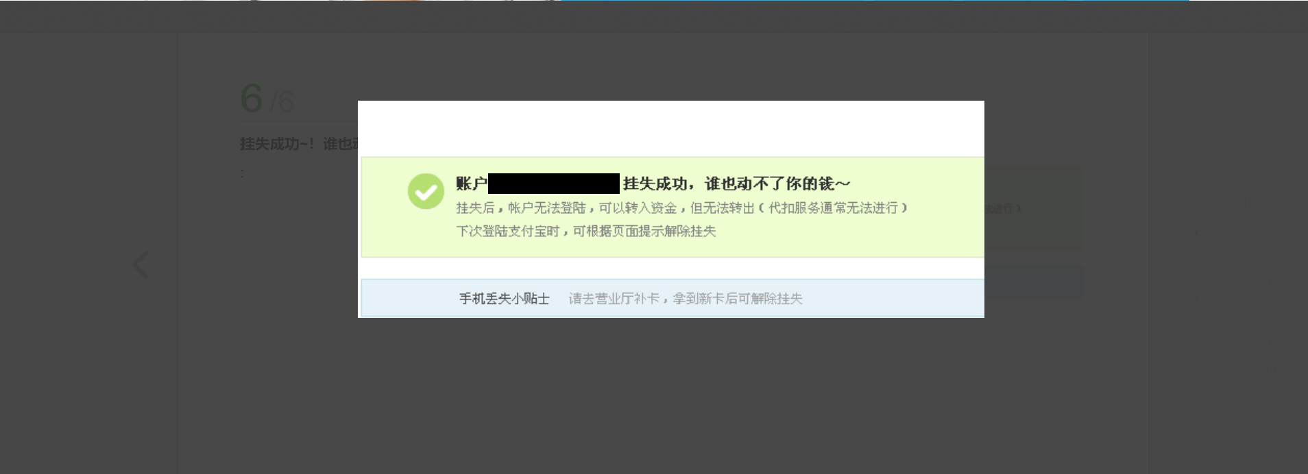 「*****のアカウントの紛失報告が成功しました。誰もあなたのお金を動かせません」と表示されました。