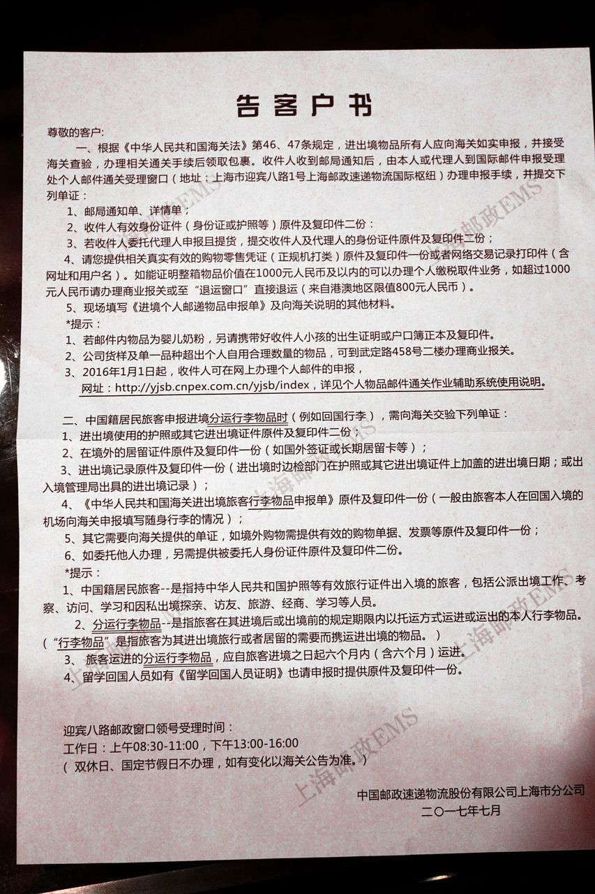 詳細は関係のない部分も多いので省きますが、要約すると、「必要な書類を持って『上海邮政速递物流国际枢纽』に取り来なさい」という旨です。この施設名、訳しにくいのですが、「上海郵便局宅配便等物流国際センター」というところでしょうか。