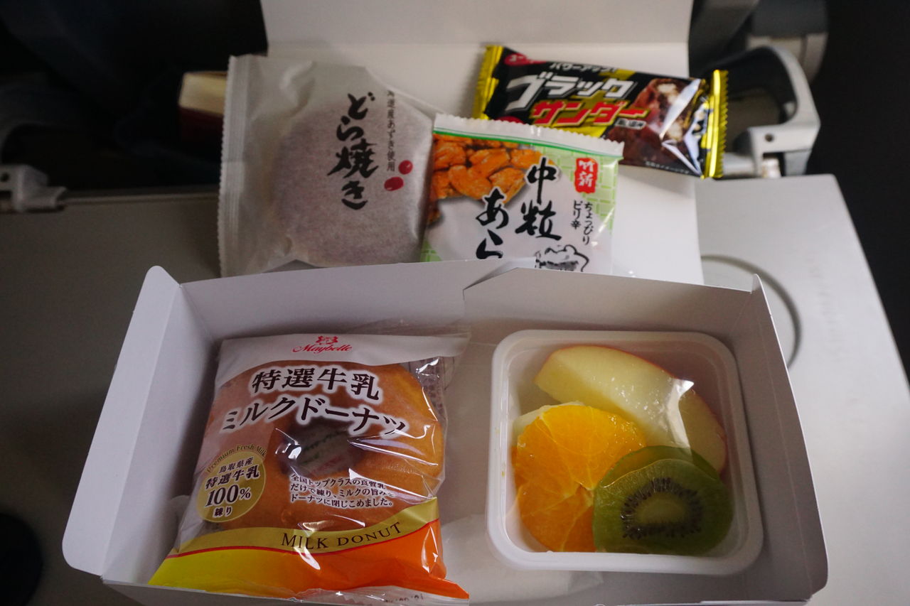 As mentioned above already, the in-flight meal of CA406 is an assort of snacks and fruits. This would be probably because of the departure time (14:15/14:45), which is slightly late for lunch. If still full from lunch, don't worry, you can just have fruits on the plane and take snacks away.