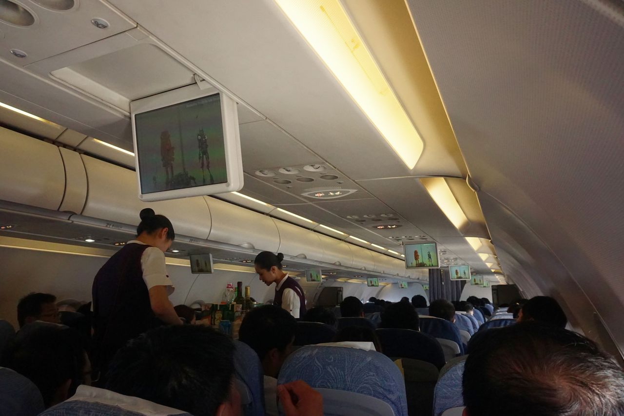 The equipment used for CA406 is Airbus 321, a narrow body plane without indivisual in-flight entertainment. I thought the three-hour flight without the in-flight entertainment might be too boring especially for children when I saw some of them shouting in a loud voice...