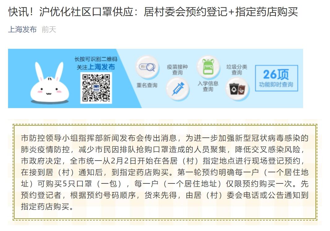 供給不足になる中で、1月31日、上海市は2月2日以降マスクを予約購入制にする旨の通知を出しました。