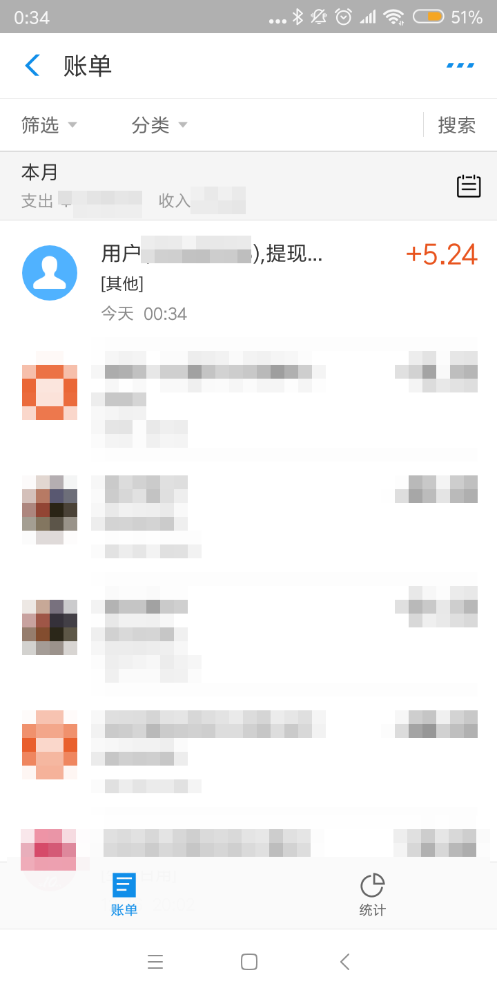 念のため支付宝の账单(明細)を確認すると、5.24元が収入として加算されています。