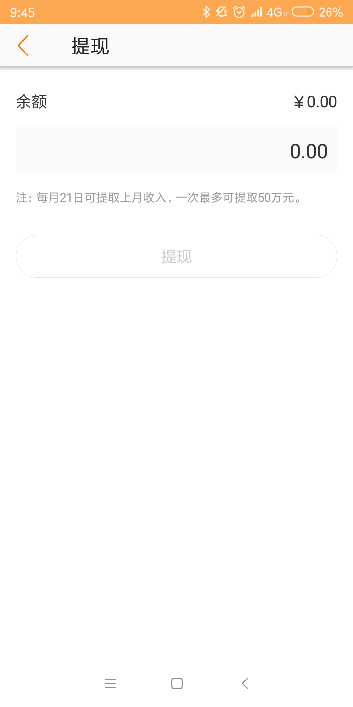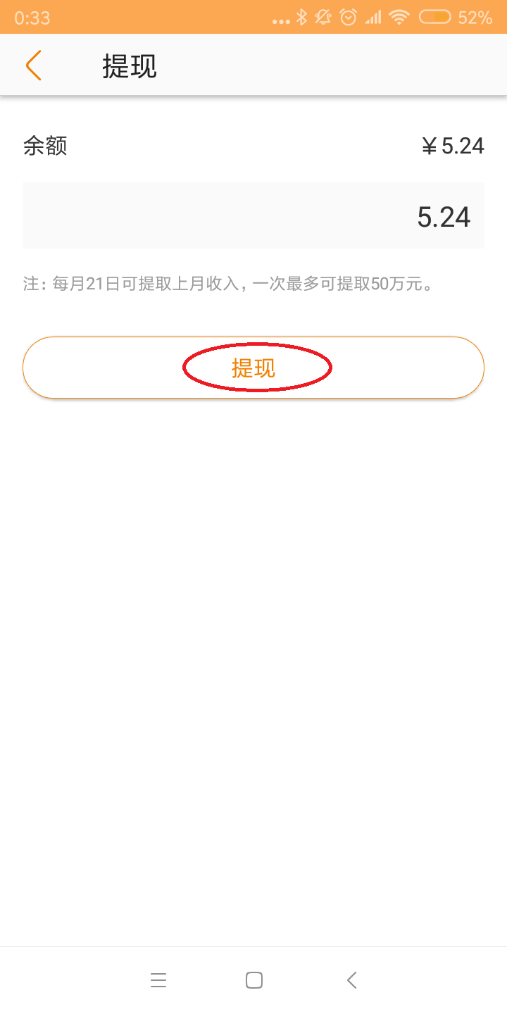 画面上部の「可提现余额」(現金化可能金額)の欄に受取り可能な額が表示されるので、その横の「提现」をタップします。
