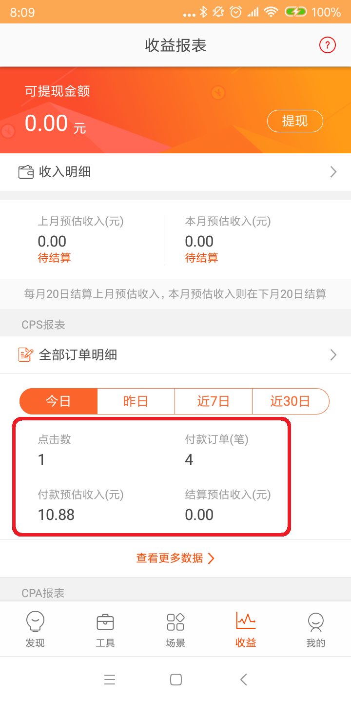 自分が貼ったリンクから購入につながると、淘宝联盟アプリの「收益」画面で