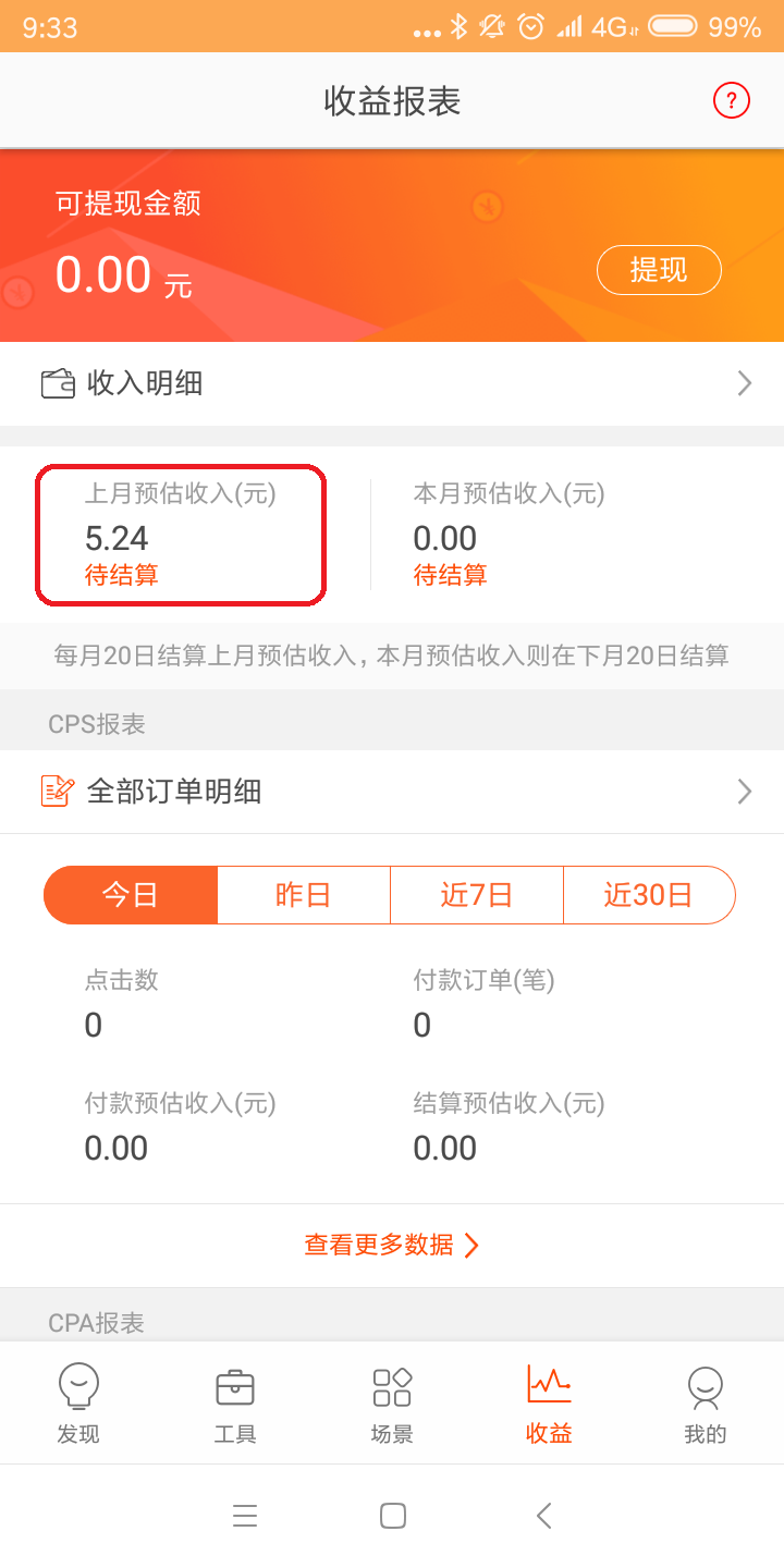 締め日を迎えると、「上月预估收入」(先月の予測収益)という欄に、翌月受け取れる予定の収益が表示されます。