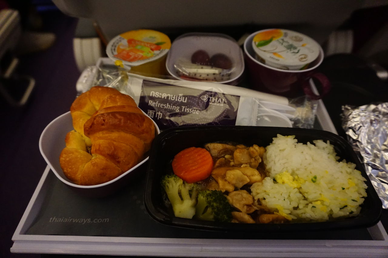 You can enjoy a substantial in-flight meal on TG663. There were two options for the main dish: chicken rice or pork noodles. The others were bread, yogurt, orange jelly and fresh fruits.